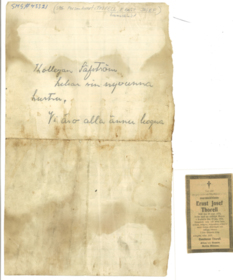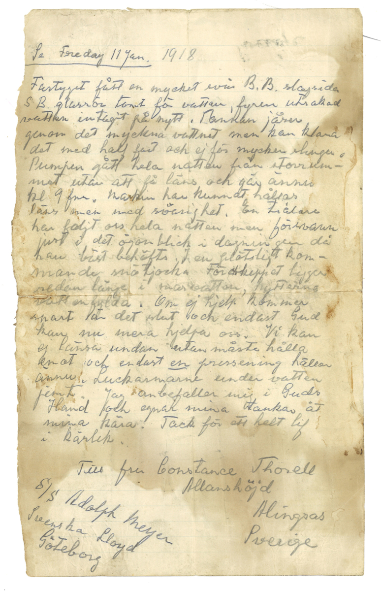 Flaskpost (utan bevarad flaska) sänd av övermaskinist Ernst Josef Thorell ombord ADOLPH MEYER innan fartygets totalförlisning den 12/1 1918. Flaskposten är adresserad till fru Constance Thorell, Allanshöjd, Alingsås, Sverige. På baksidan en hälsning från 'kollegan Säfström'. Enligt uppgift från givarna flöt flaskposten iland på norska kusten och en norsk sjöman lämnade flaskposten till änkan (Anna Konstantia) ca ½ år efter förlisningen.