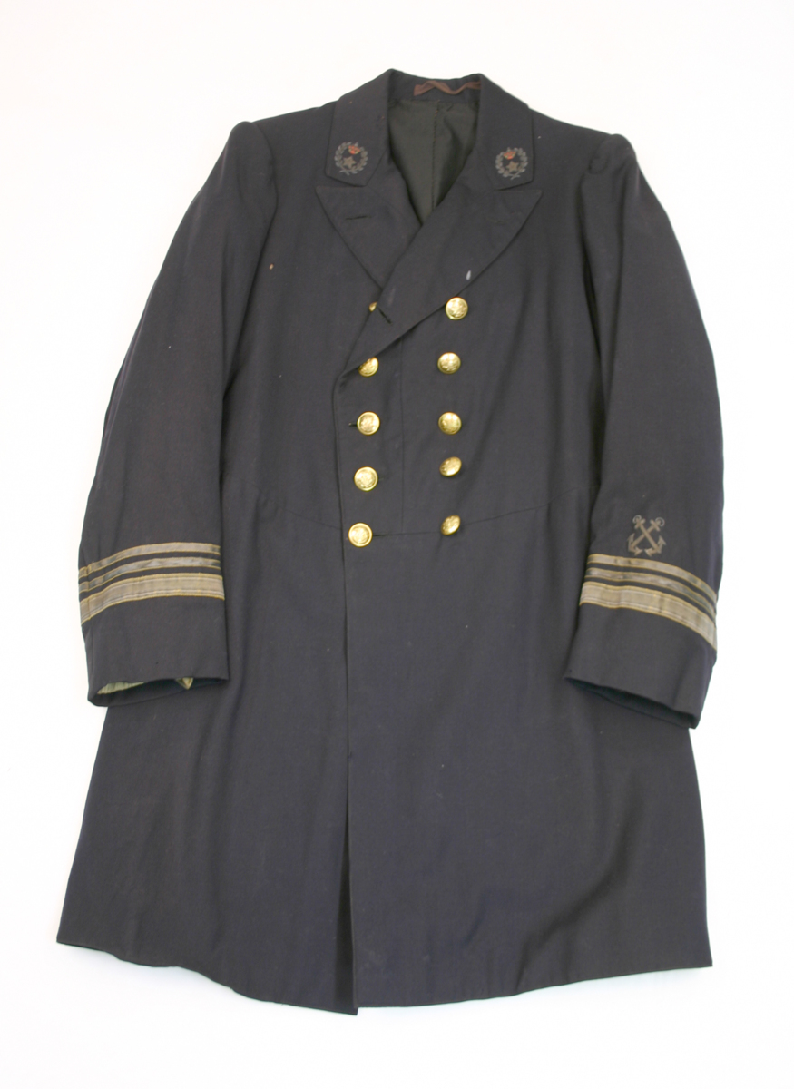 Uniformsrock med mässingsknappar för sjökapten. På vardera ärm 2 galoner som är 7 mm breda och en som är 20 mm bred. På vänster ärm två korslagda ankare. På vardera krage krona och femuddig stjärna inom bladkrans. Galonerna anger 'Capitaine d´Steamer de 1re cl'.