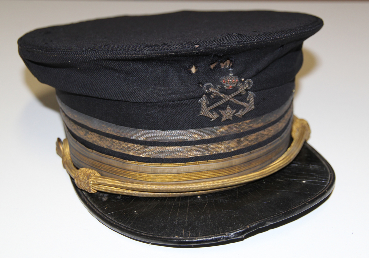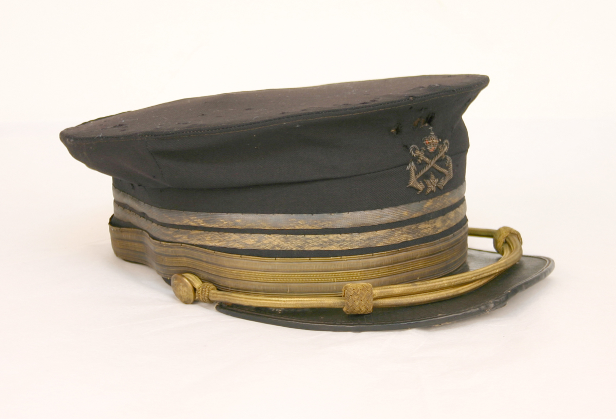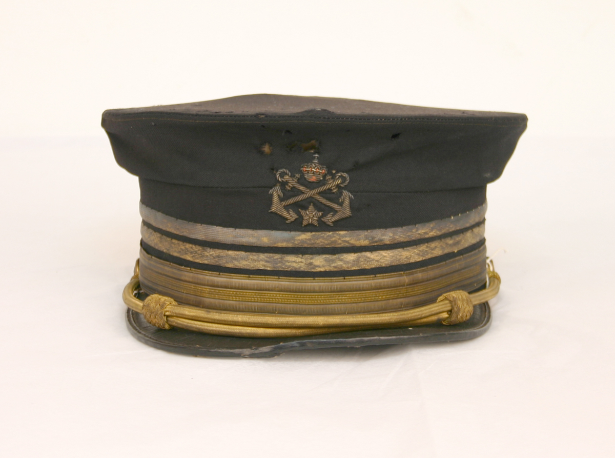 Uniformsmössa för sjökapten, av svart kläde och svart skärm, med 3 huvudband, 2 st 7 mm breda och 1 st 20 mm bred, samtliga av guld, med direkt på mössan broderat mössmärke bestående av två korslagda ankare, krona och femuddig stjärna. Litt: Persson, John E.; Den vite mannesn grav, sid 187 f.