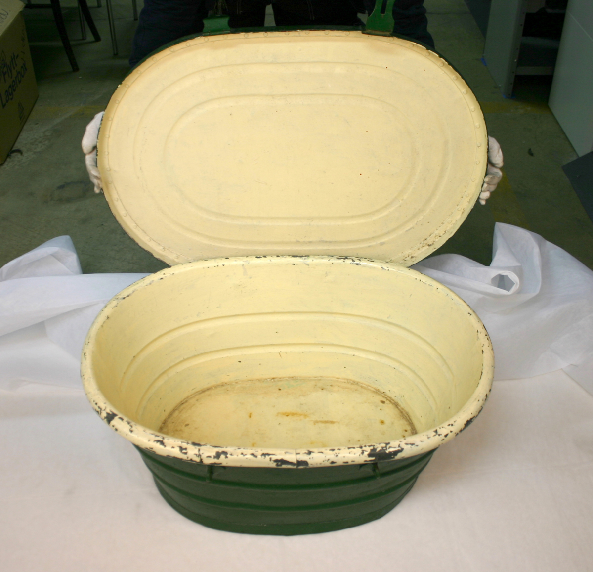 Resebadkar och klädkista av zinkplåt med avtagbart lock, underbotten av tropiskt trä. Sekundärt grönmålad utsida och gulvit insida. Har använts i Kongofristaten ca 1904-1910.