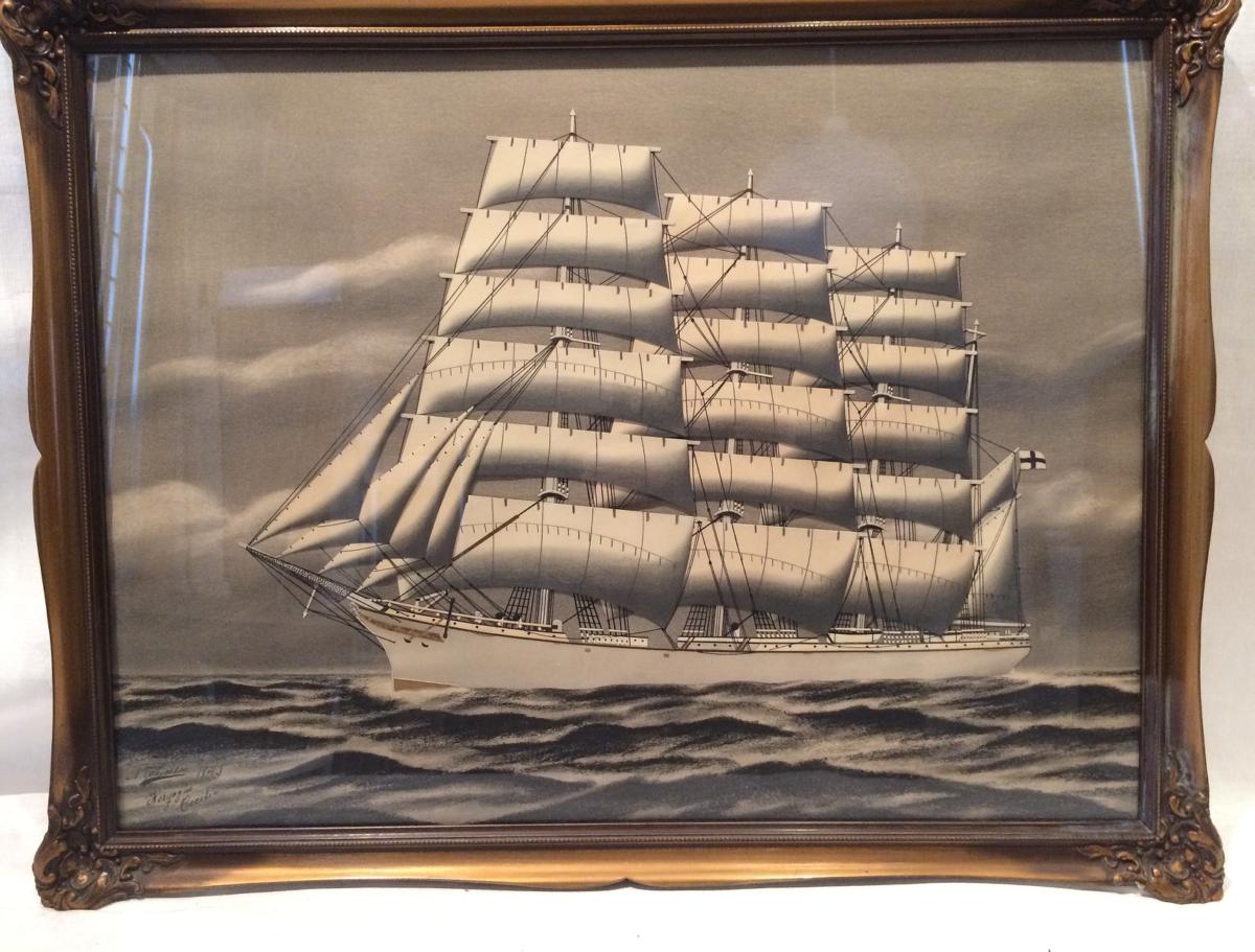 På pappstycke med kritmålad himmel och hav. En seglande fyrmastbark sett mitt förifrån gjord i delvis målade pappbitar som är uppklistrade i olika skikt. Fartyger för den finska flaggen i aktern. I orginalram.