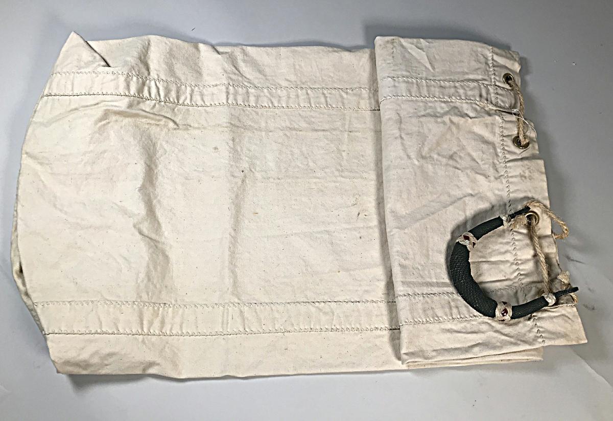 Handsydd sjösäck av segelduk sydd på traditionellt sätt. 8 stycken öljetter vid öppningen med säcklås utan sprint. Säcklåset är tränsat och grönmålat, med 2 st valknopar målade i rött och vitt.