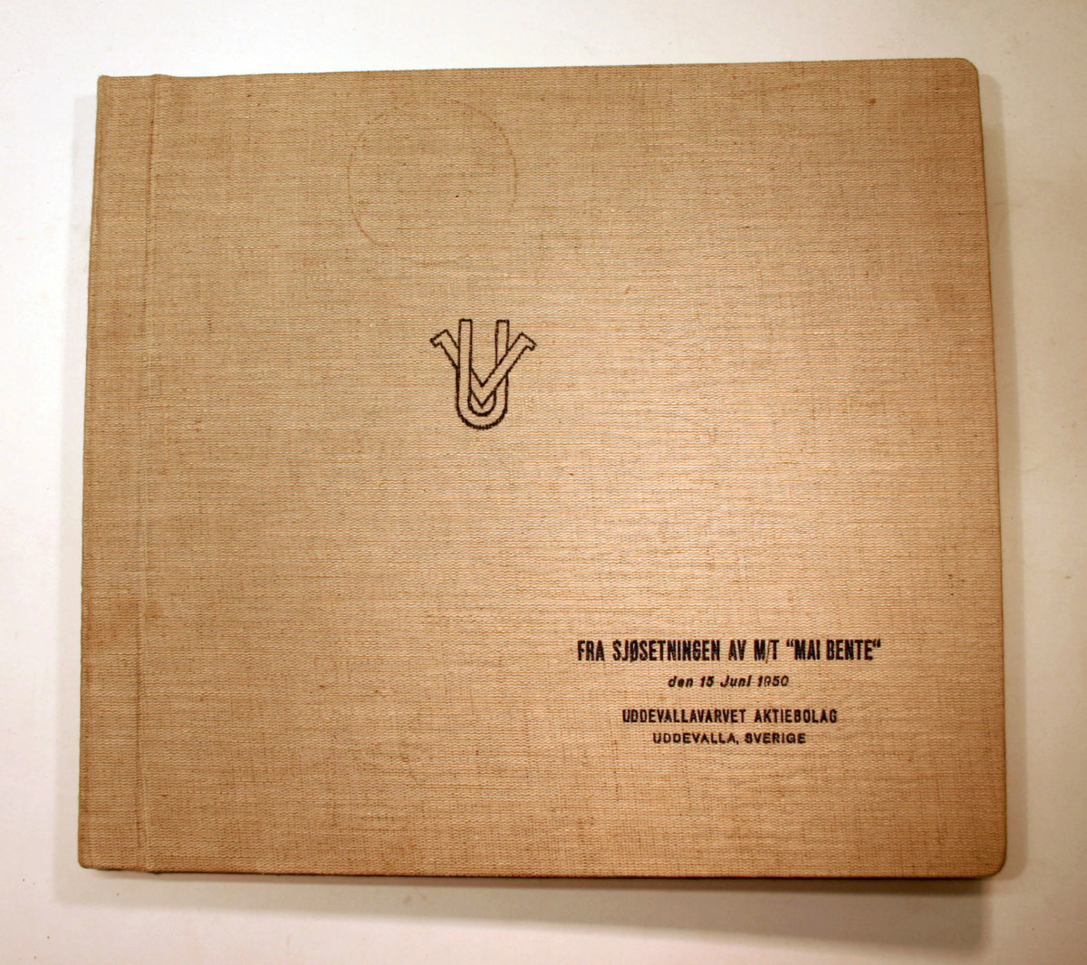 Tryck: Fra Sjosetningen av m/t "Mai Bente" den 15 juni 1950 Uddevallavarvet Aktiebolag Uddevalla Sverige [logga]