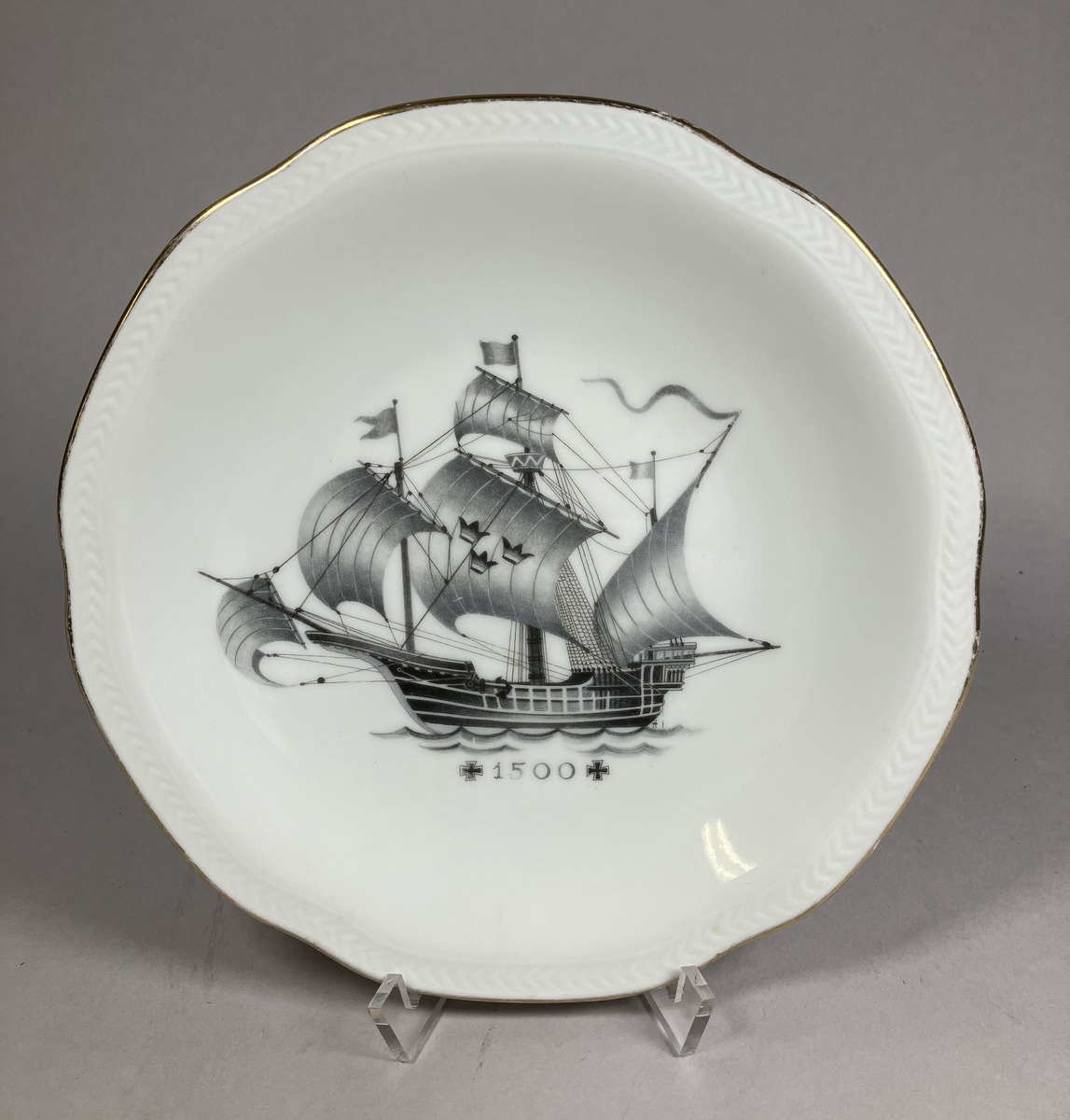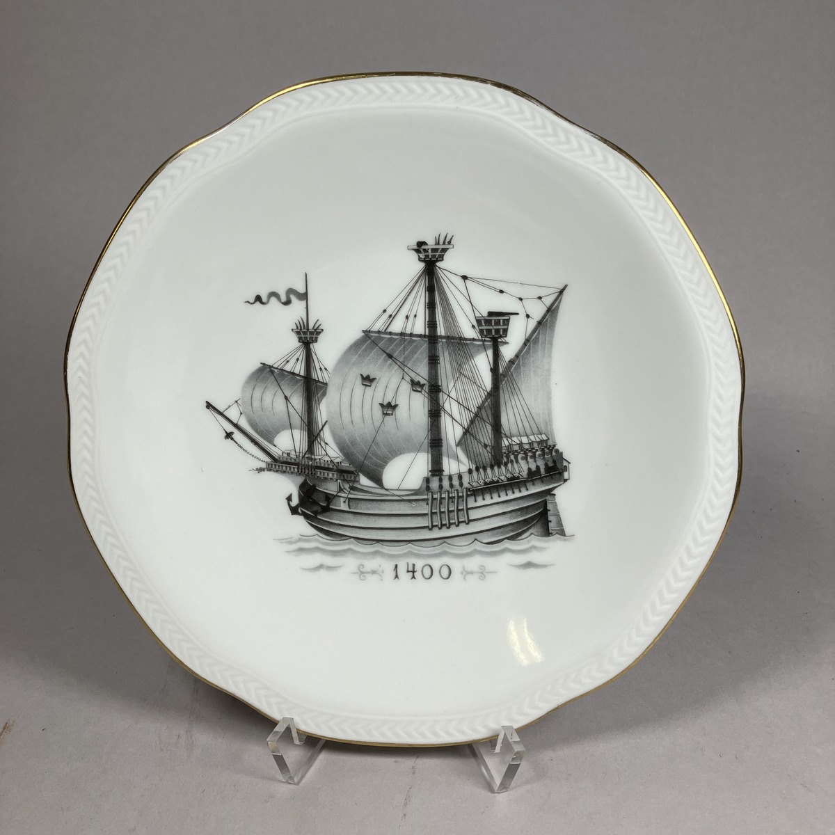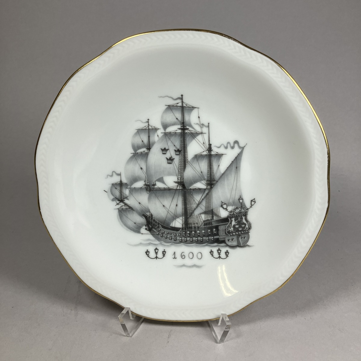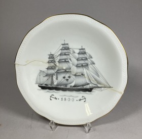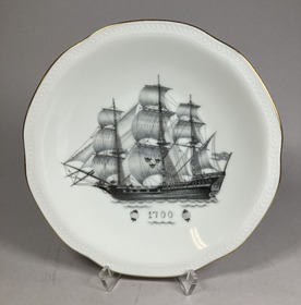 Fruktassietter, 6 st, med olika motiv visande fartyg från olika århundraden samt därunder tiden för motivet; 1000 (SMG 43398, a), 1400 (SMG 43398, b), 1500 (SMG 43398, c), 1600 (SMG 43398, d), 1700 (SMG 43398, e), 1800 (SMG 43398, f). Motiv och siffror i svart och grått, bård runt är i guld. Assietterna, som tillverkades under lång tid, troligen ända in på 1950-talet men då av Rörstrands, såldes normalt ombord på SAL-fartygen. Givaren har haft minst en assiett ytterligare, men denna har slagits sönder. Givarens man , Sven, fick dem i avskedspresent när han 1939 slutade sitt chaufförsarbete. Litt: Munthe, Gustaf: Swedish arts and Crafts on m/s Kungsholm, Göteborg 1934, sid 22, 26.