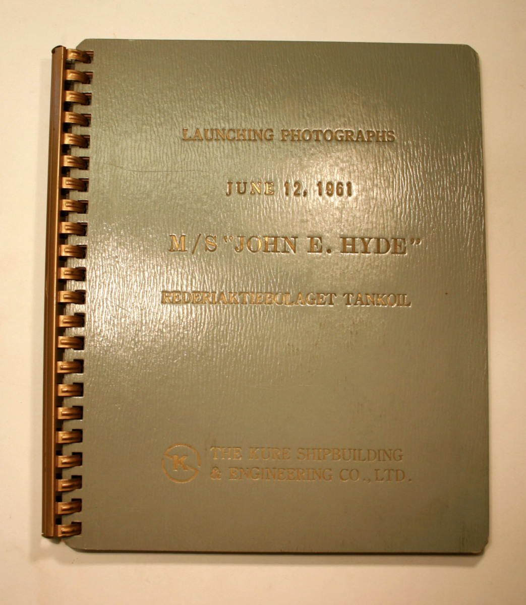 Fotoalbum av grå papp med mässingsrygg samt med texten i guld på framsidan. Innehåller vykort i färg och svartvita fotografier från sjösättning av M/S JOHN E HYDE 12 juni 1961 när fartyget blev ombyggd till bulkcarrier.