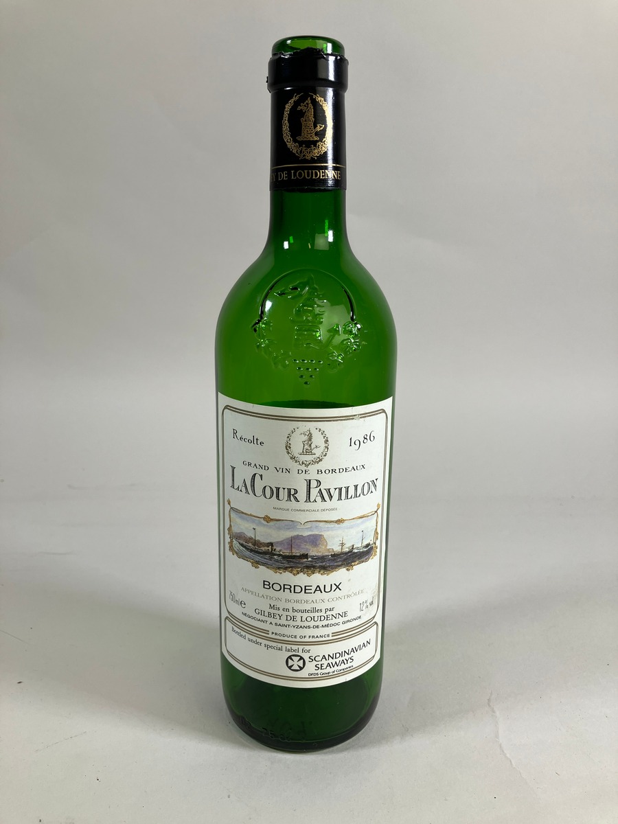 Vinflaska för rödvin av märke: LaCour Pavillon Bordeaux 1986. På etiketten dessutom texten: 'Bottled under special label for Scandinavian Seaways, DFDS Group of Companies. Flaskan är köpt ombord på DFDS:s färja till Amsterdam i aug. 1990.