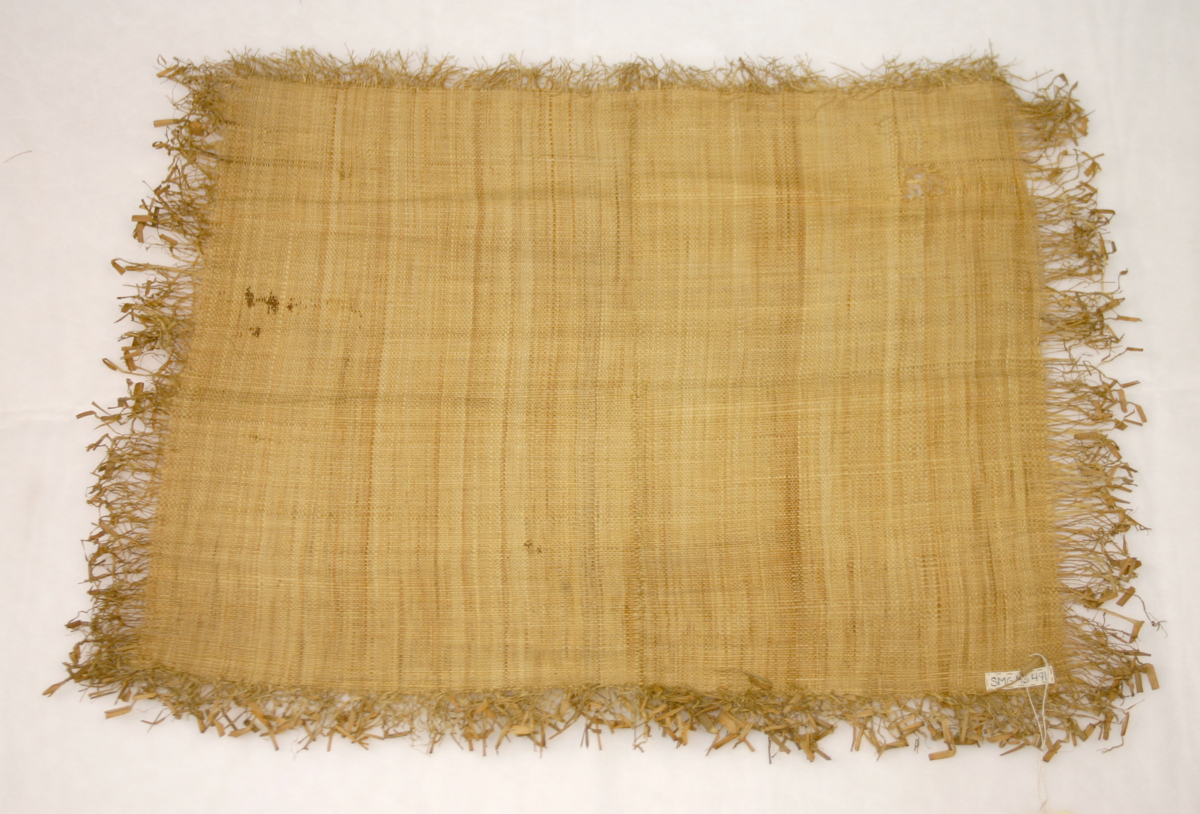 Tillverkad av en man i Kongo, av ofärgat gräs. Text från givaren (kapten Larsson): " Mattorna äro af färgat gräs och flätade för hand. Användes som kjolar. En del hade kjolar af bast och af blad som balettkjolar".