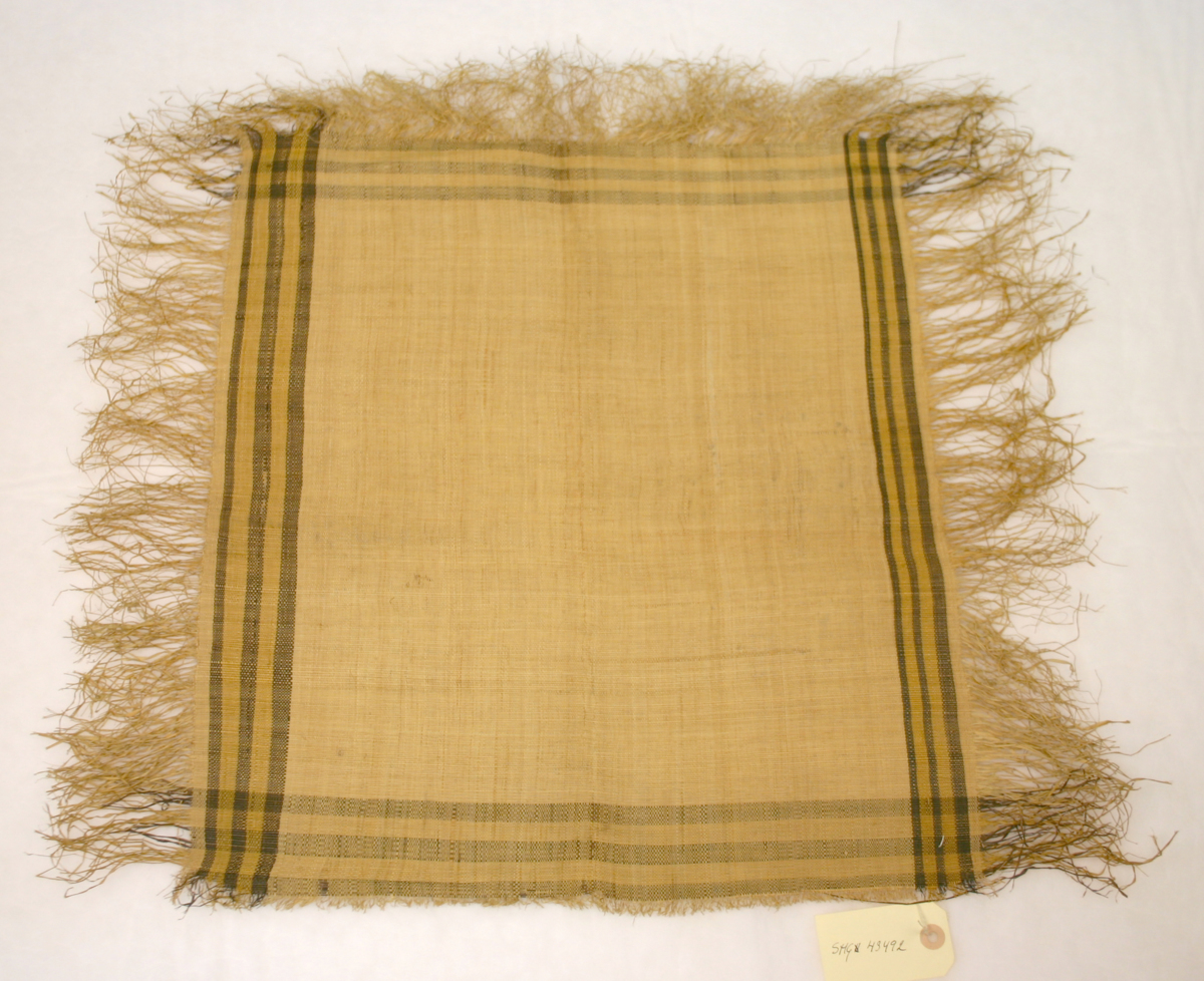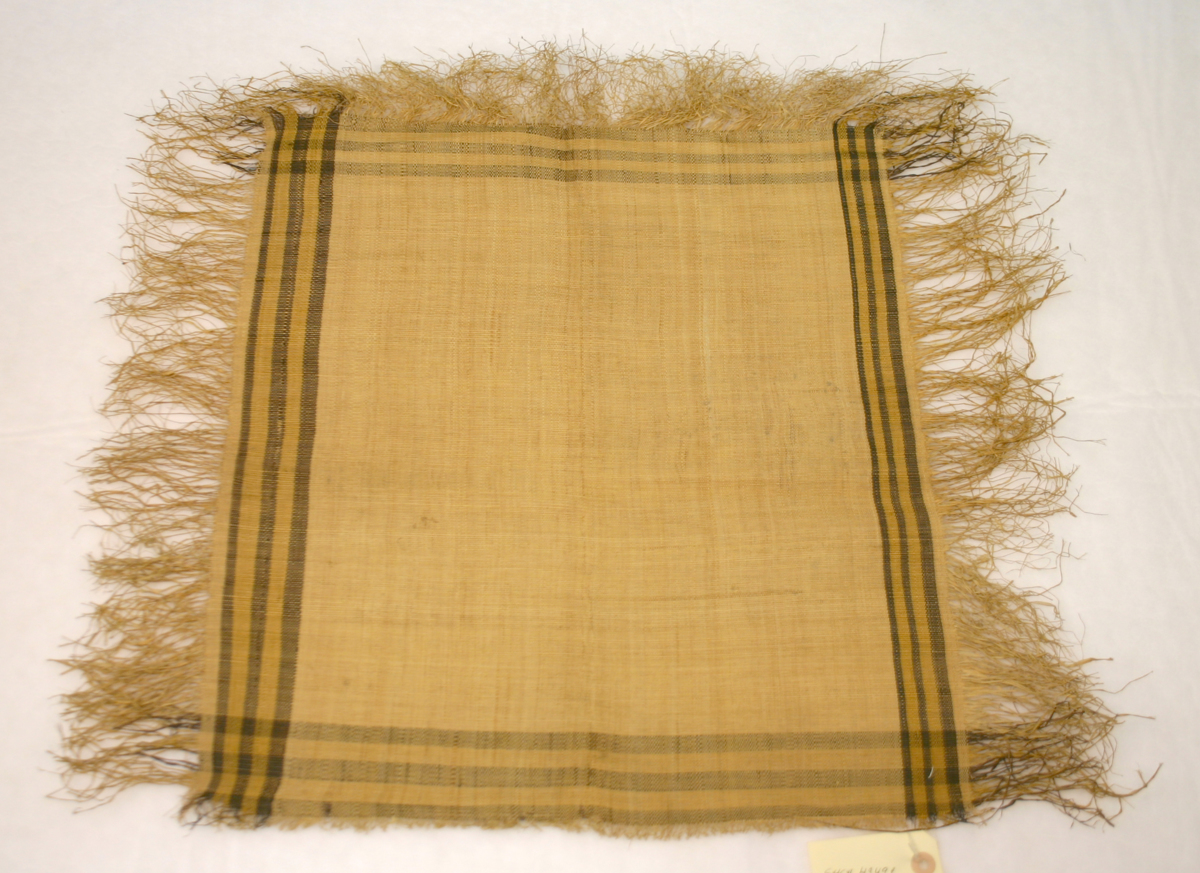 En grövre kvadratisk Textil av växtfibern raffia vävd i tuskaft med mönster i varp och inslag i form av ränder i två nyanser. Brunt och gult i varpens ytterkanter och brunt i varpens övre och nedre kant. Fransar runt om (lämnad varp och inslag) På tre sidor varierar fransarnas bredd mellan 7-13cm, medan en kant endast har en frans på 1 cm. Dessa textiler användes som betalningsmedel men även ibland till kläder såsom kjolar och mantlar. Textilen är vävd på liten kvadratisk vävstol med enskaftad solv (endast en skaftkäpp) där väven sträckts på en ram som var lätt att rulla ihop och ta med sig.