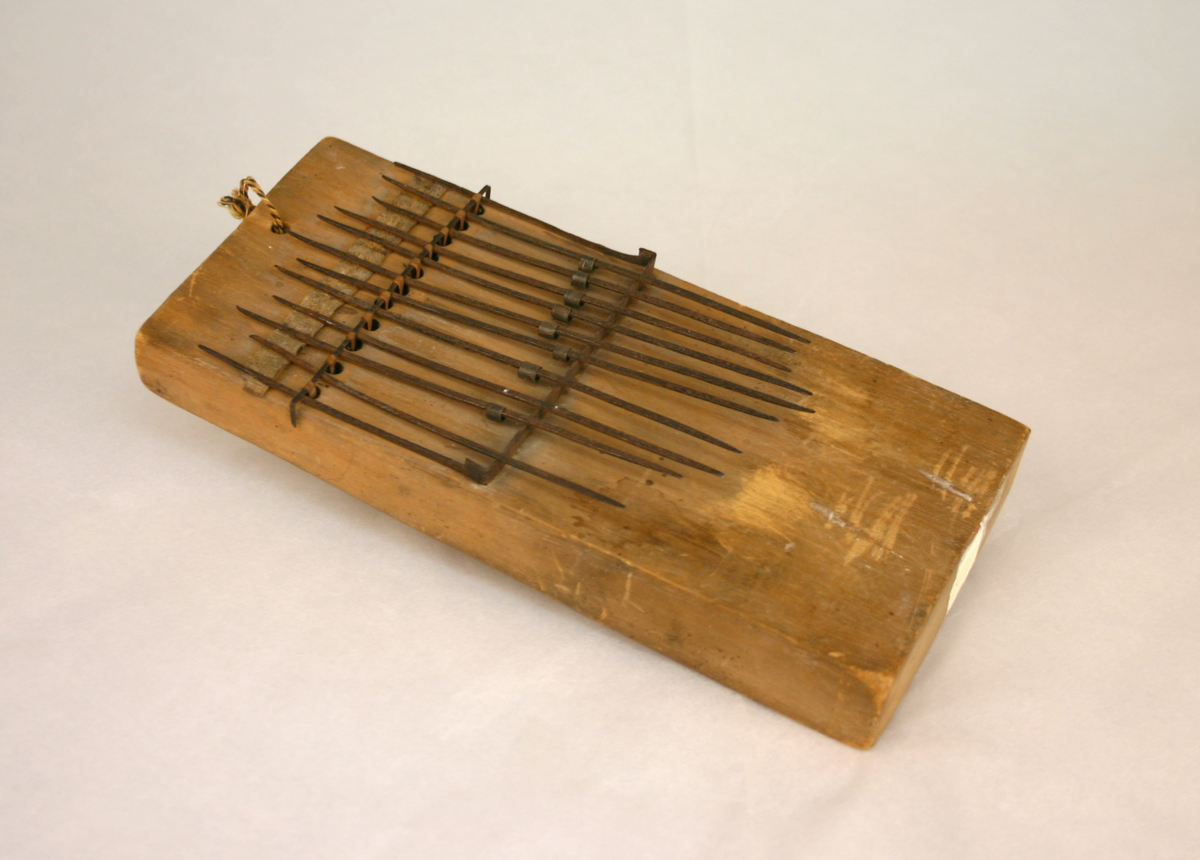 10 tungor av järn fästade på resonanslåda av trä. Tungorna är olika långa, vilket ger olika tonhöjder när man knäpper på dem.