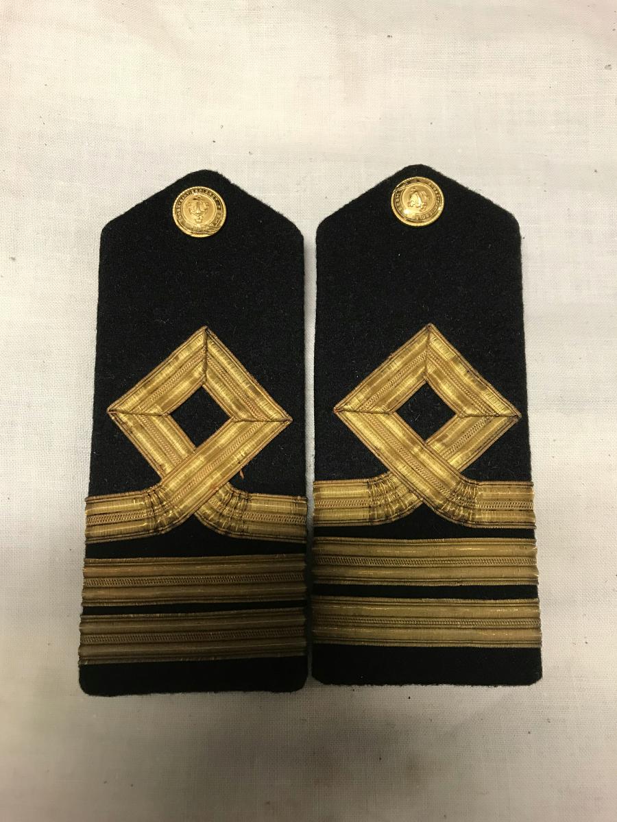 På de mörblåa klädet är det påsytt 3 galoner och en trekantig ögla i vilken en knapp sitter med texten Ångbåts AB Ferm