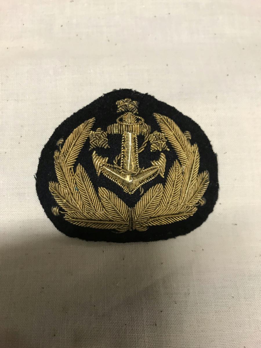 Pappskiva överklädd med svart filt och en lagerkrans och ankare broderad med guldtråd.