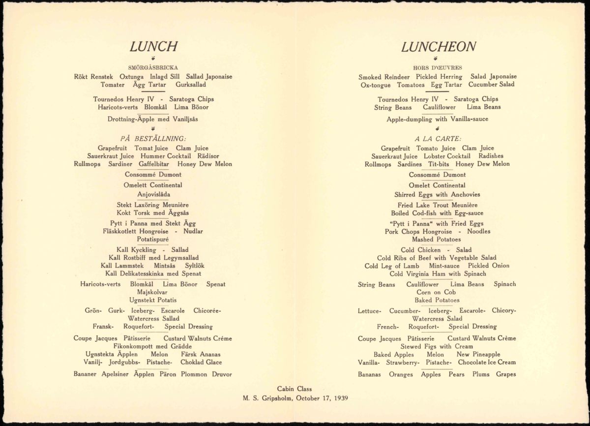 Tryckt matsedel för den 17 oktober 1939 i Cabin Class. Bilden på menyn förestället Läckö Slott.
