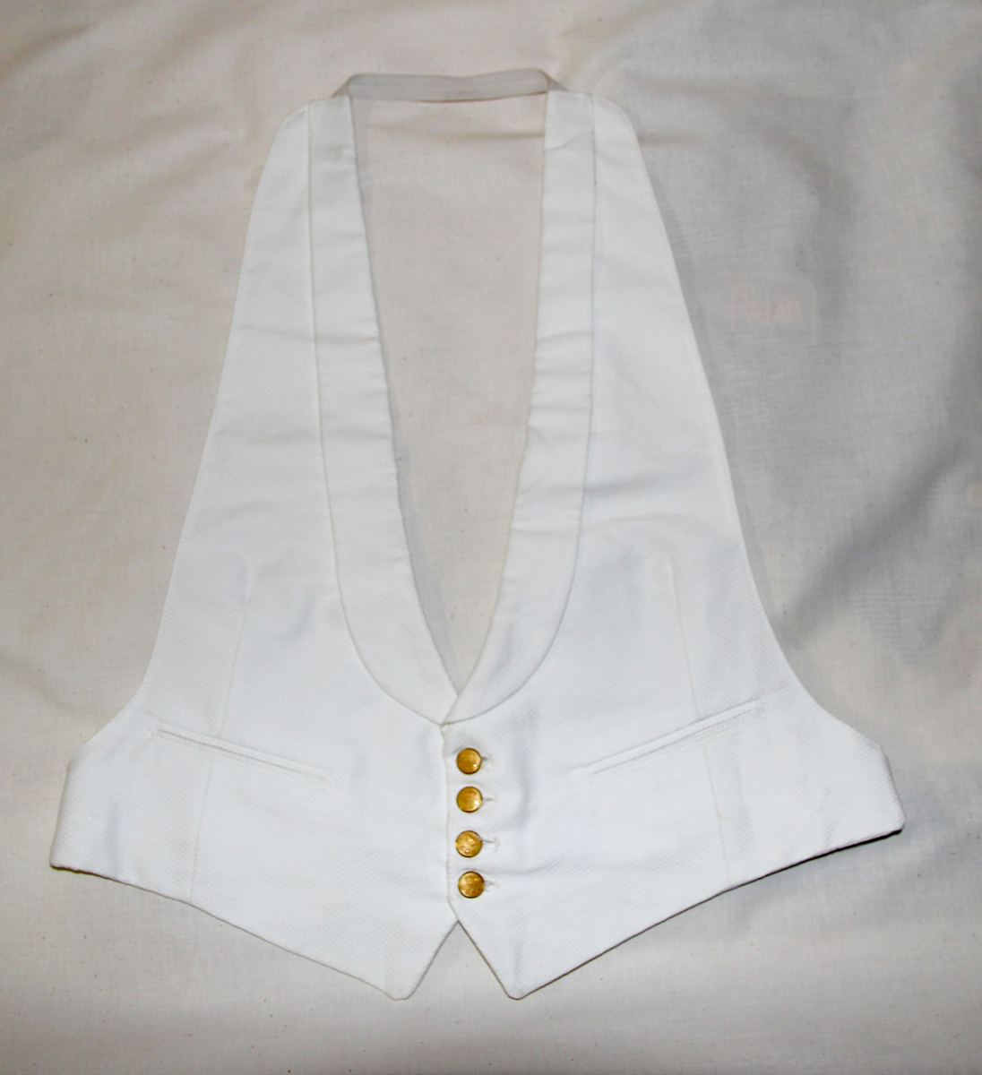 Gå tillbaka till sökPublic DomainLägg till i Min samlingKopiera länkSkriv utFrackvästAktörerJohnson Line (1904 - 1991), Brukare Göteborgs Kungliga Segel Sällskap (GKSS) (1860 - ), BrukareKategoriväst (Kläder)Material och tekniktextil, mässingMärkningRelief: GKSSDimensionerStorlek (Fel) 48,00 InventarienummerSMG43562, bUtställdInte utställd på museetBeskrivningVit frackväst med fyra mässingsknappar för mässutstyrsel.