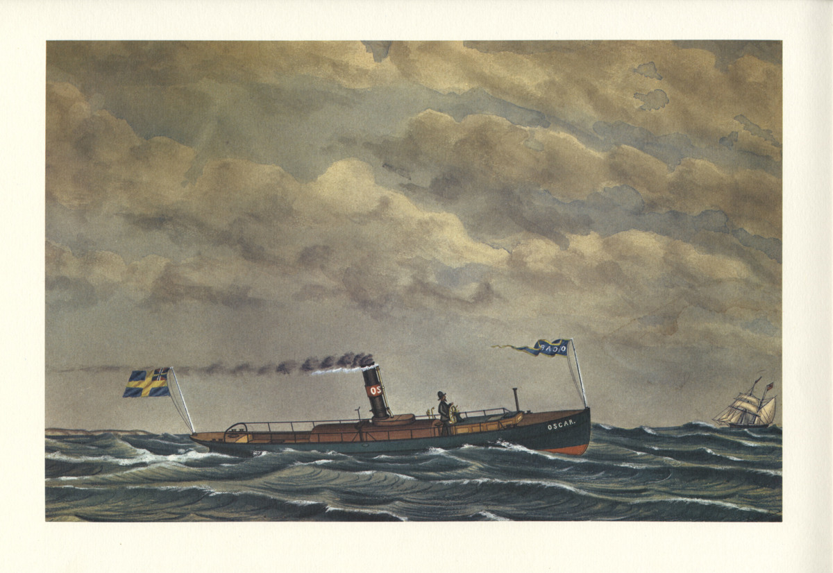 Ingår i en mapp med färgtryck föreställande Röda Bolagets fartyg. Ångslupen Oscar från början av 1870-talet. Maskinstyrkan i denna typ av bogserbåtar, bolagets första, utgjorde ca 35 HK.