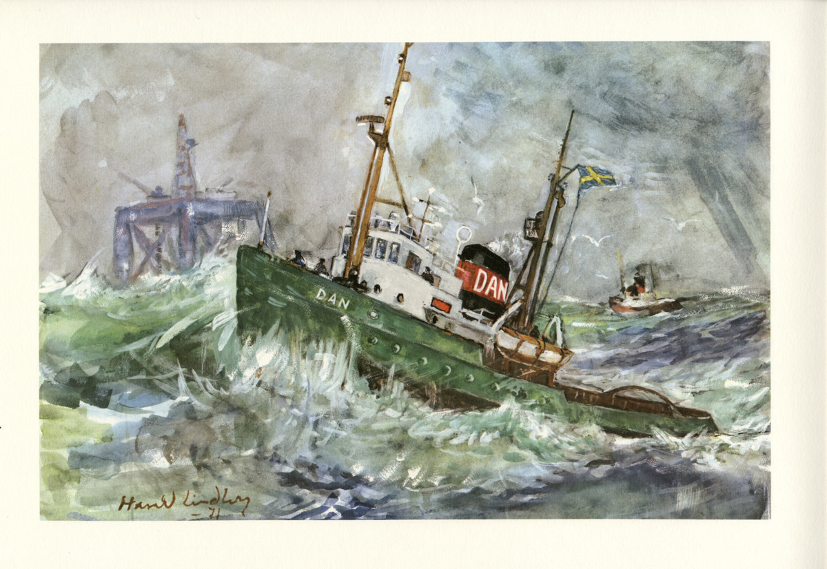 Ingår i en mapp med färgtryck föreställande Röda Bolagets fartyg. DAN, byggs 1965, maskinstyrka 6.000 HK. Bolagets största och starkaste isbrytande bogser- och bärgningsfartyg. Stationerad i Göteborg med Öresund, Östersjön, Kattegatt och Nordsjön som arbetsfält. DAN har under flertalet år bland annat assisterat borrtorn på Nordsjön.