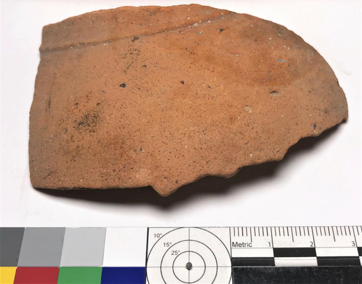 Krukskärva utan glasyr. Har tillhört kärlets axelparti. Kort finns, saknar placering i liggare 2003-11-25 Upptagen från vraket av Göteborgs Amatördykarklubb 750609.
