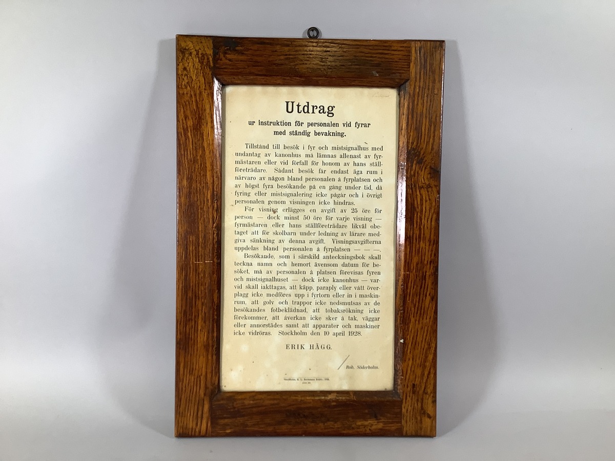 Glasad och ramad tavla med Utdrag ur instruktion för personalen vid fyrar med ständig bevakning.