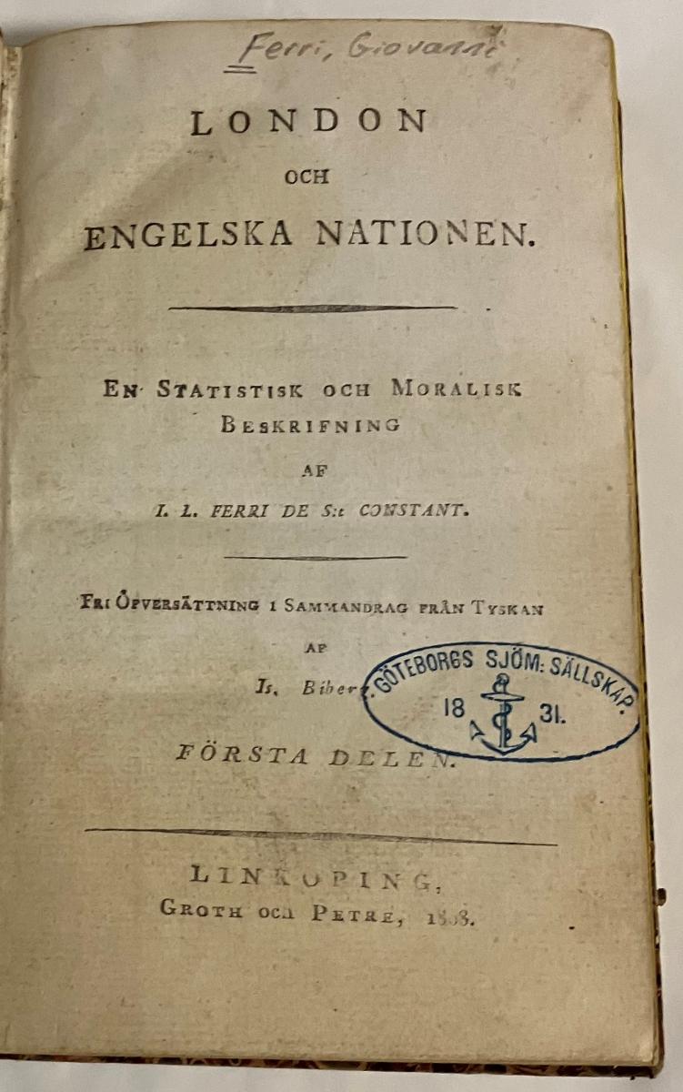 Ferri, Giovanni di S. Constant, London och engelska nationen. En statistisk och moralisk beskrifning af I. L. Ferri de s:t Constant. Fri öfversättning i sammandrag från tyskan af Is. Biberg. Linköping, Groth och Petre. =1-4. 1808=. [Del 1], Första delen. 1808., Linköping, Groth och Petre, 1808., 1808