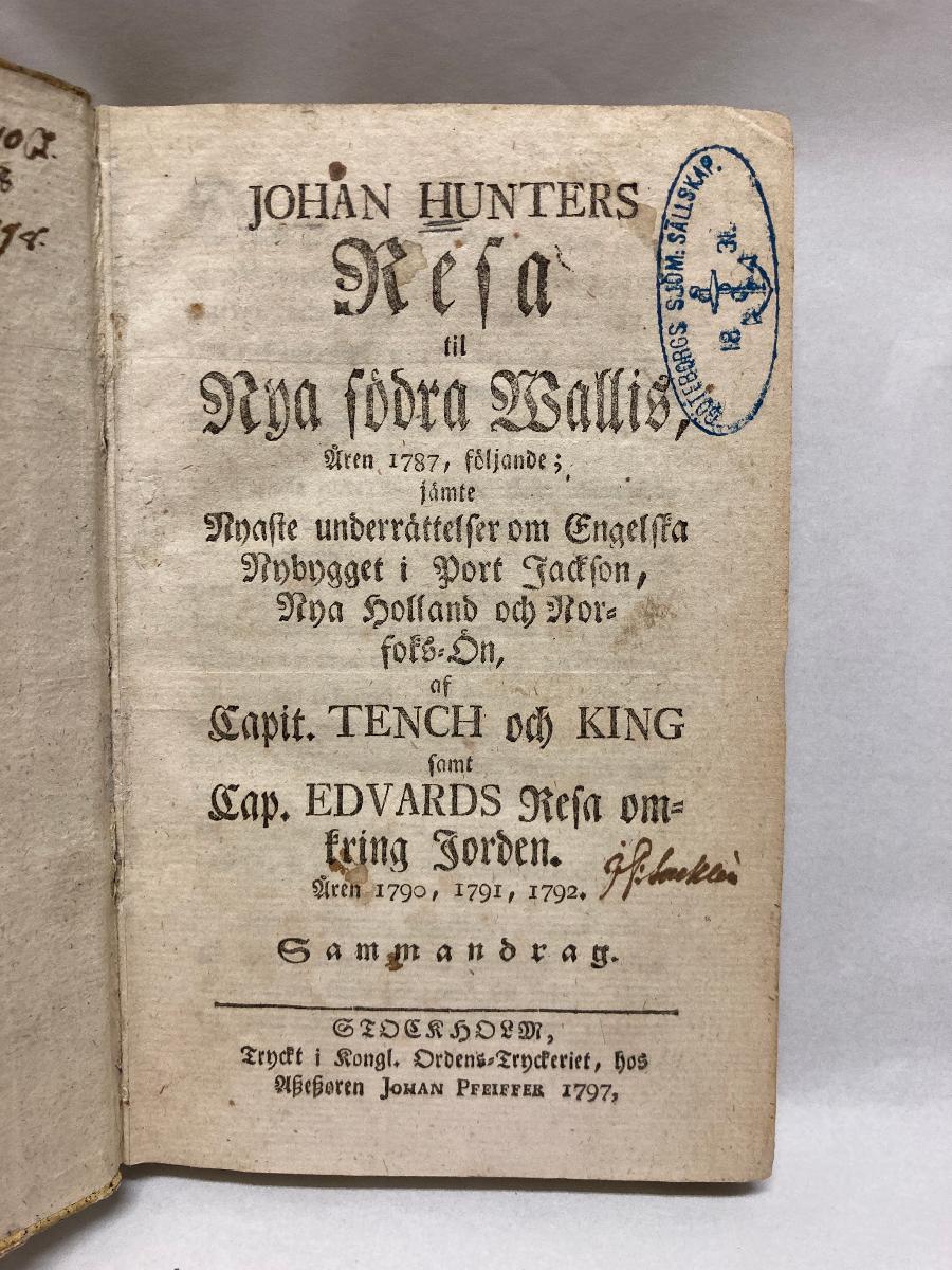 Johan Hunters Resa til nya södra Wallis, åren 1787, följande; jämte nyaste underrättelser om engelska nybygget i Port Jackson, nya Holland och Norfoks-ön, af capit. Tench och King samt cap. Edvards resa omkring jorden. Åren 1790, 1791, 1792. Sammandrag. Stockholm, tryckt i kongl. ordens-tryckeriet, hos aszeszoren Johan Pfeiffer 1797,