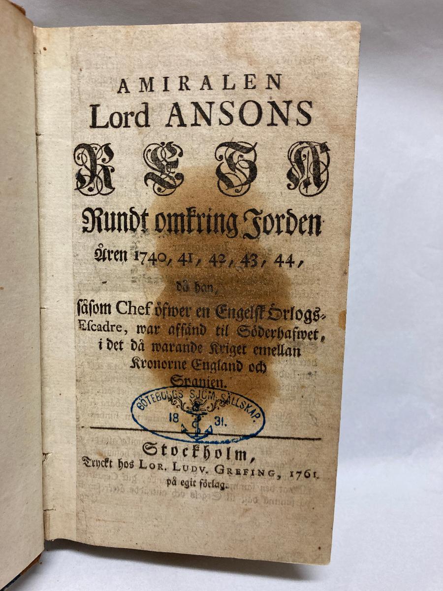 Amiralen lord Ansons Resa rundt omkring jorden åren 1740, 41, 42, 43, 44, då han, såsom chef öfwer en engelsk örlogs-escadre, war afsänd til Söderhafwet, i det då warande kriget emellan kronorne England och Spanien. =Anon.= Stockholm, tryckt hos Lor. Ludv. Grefing, 1761. På egit förlag