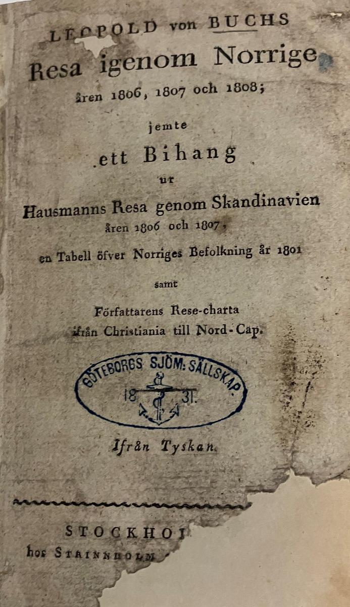 Buch, Leopold von, Leopold von Buchs Resa igenom Norrige åren 1806, 1807 och 1808; jemte ett bihang ur Hausmanns resa genom Skandinavien åren 1806 och 1807, en tabell öfver Norriges befolkning år 1801 samt författarens rese-charta ifrån Christiania till Nord-Cap. Ifrån tyskan. Stockholm 1814, hos Strinnholm och Haeggström, (Strinnholm : Haeggström, Stockholm, 1814