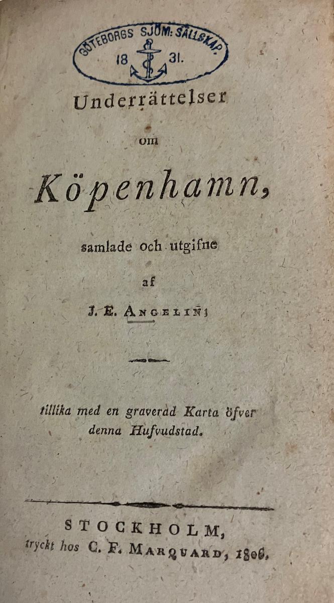 Angelini, Jöns Eric, Underrättelser om Köpenhamn, samlade och utgifne af J.E. Angelin; tillika med en graverad karta öfver denna hufvudstad. Stockholm, tryckt hos C.F. Marquard, 1806, Marquard, Stockholm, 1806