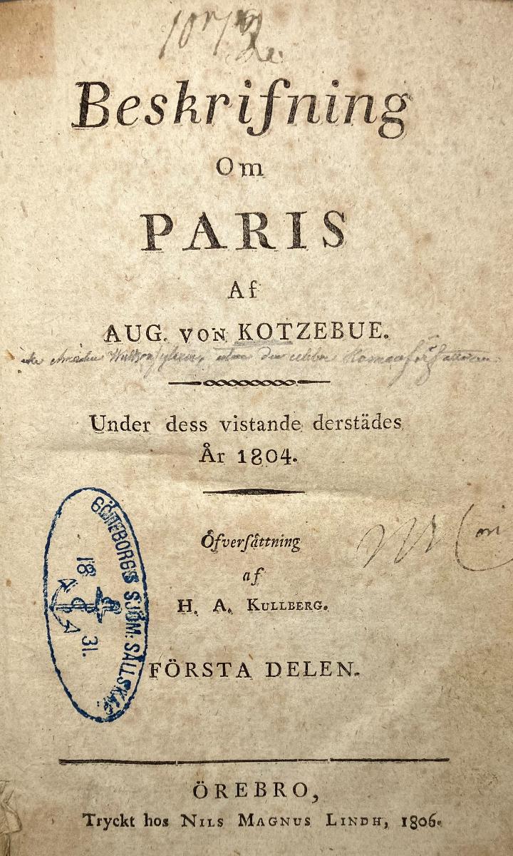 Kotzebue, August von, Beskrifning om Paris af Aug. von Kotzebue. Under dess vistande derstädes år 1804. Öfversättning af H.A. Kullberg. Örebro, tryckt hos Nils Magnus Lindh. Första delen. Örebro, 1806