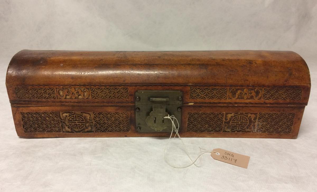 Kinesiskt läderskrin för opiumpipor. Stomme av trä klätt med läder, dekorerat med präglat mönster. Beslag i mässing.