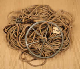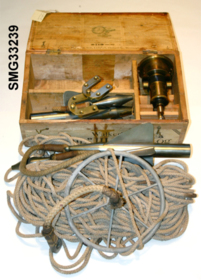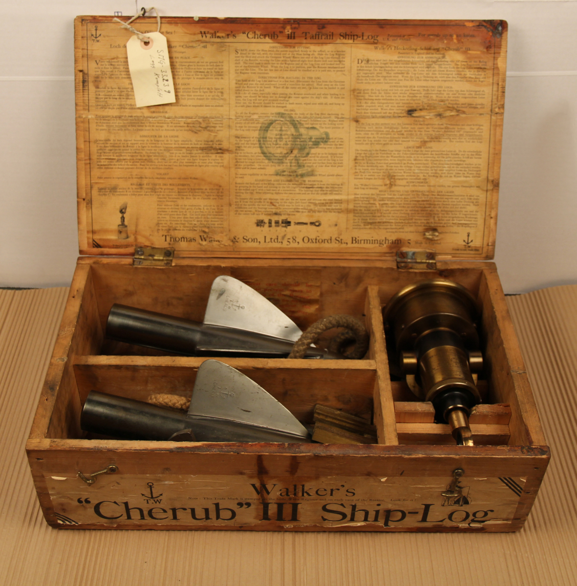 Komplett "Cherub" III Ship-Log, logg i trälåda. Vinda och lina förvaras löst. Loggen har använts av Länsstyrelsen i Göteborg när de gav navigationskurser för yrkesfiskare på 50- och 60-talet.