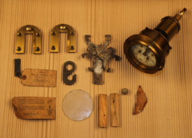 stål, mässing, glas, trä, lin