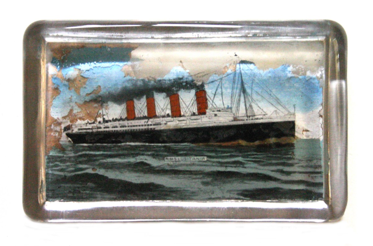 Brevpress av glas med bild av s/s 'Lusitana'