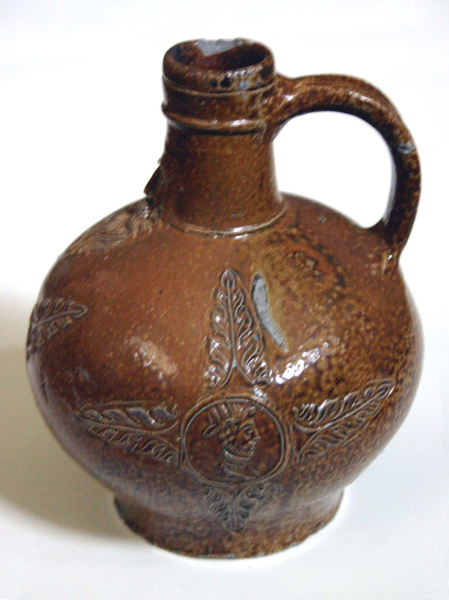 Krus i brunt stengods från Rhenlandet, en så kallad Bartmann-Krug från Frecher. Daterat till 1500-talets slut eller början av 1600-talet.