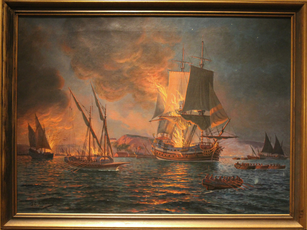 'Kaparefregatten Grefwe Mörner i brand å Älfsborgsfjorden efter det den tagits av Tordenskiold i Nya Varvets hamn samt utbogserats. Då motvind stötte till och Tordenskiold förföljdes av svenskaren stacks den i brand. Rekonstruktion av branden efter Tordenskiolds rapport över händelsen. Oljemålning av Jens Andresen.' Ur sjöfartens hävder. En vandring genom Sjöfartsmuseet. O Traung.