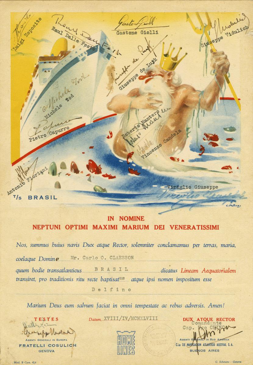 Linjedopattest för Carl-Otto Claesson ombord på fartyget BRASIL, utfärdat 18/4 1948. Fartyget BRASIL ägdes av italienska Home Lines men hade tidigare ägts av Svenska Amerika Linien under namnet DROTTNINGHOLM.