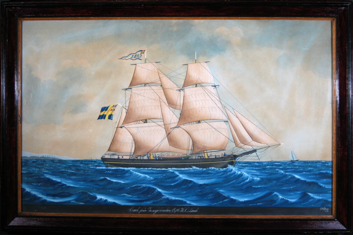 Fartygsporträtt av briggen CARL från Kungsbacka som seglas för fulla segel på bb:s halsar. Text på mörk mariginal under bilden: Carl från Kongsbacka, Capt. H Lind. Byggd i Luleå för Olof Bergmans räkning. Fartyget fick genast turkiskt pass och seglade mot Lissabon, troligtvis med järn i lasten.