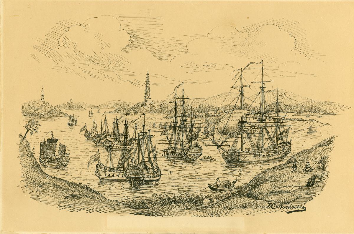Tuschteckning, ostindiefarare till ankars vid Whampoa