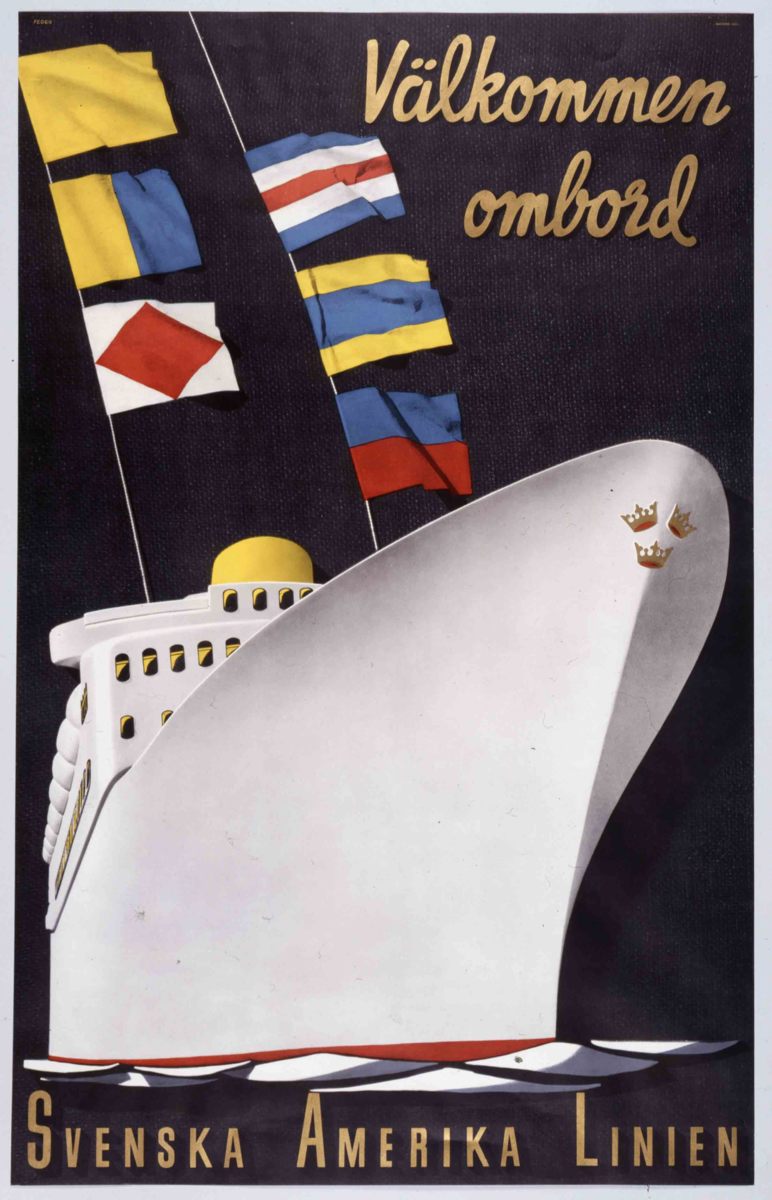 Reklamaffisch för Svenska Amerika Linien med texten ”Välkommen ombord”. Fartyget, utan namn, är vitt och har signalflaggor hissade. Exakt när denna affisch användes är oklart men motivet med vissa tillägg användes bland annat för att göra reklam för resor 1965.