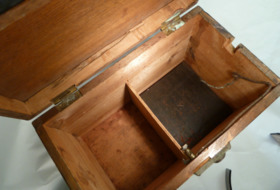 Tatueringslåda, av svartbetsat och lackat trä, med bärhandtag i läder och metallbeslag. Lådan är utformad så att den kunnat innehålla batterier troligen för att driva tatueringsmaskinerna.