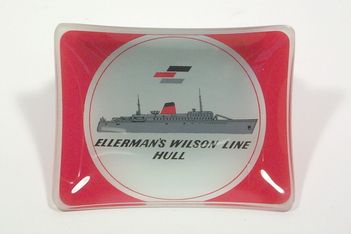 Skålad fyrkantigt askfat i jämntjockt glas. Röd med en vit crikel i mitten innehållande ett fartyg i profil samt texten, 'Ellerman's Wilson Line Hull'.