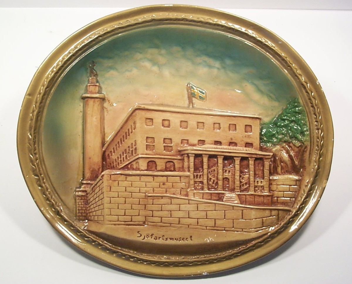 Oval skålformad gipsrelief av Sjöfartsmuseet. Reliefen är färglagd huvudsakligen i brunt med guldfärgad ytterkant.
