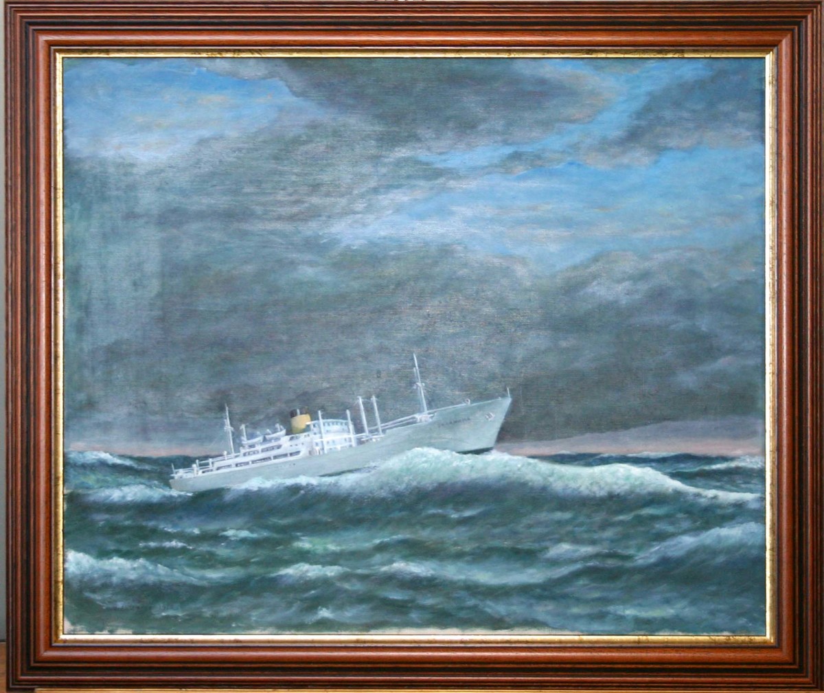 Inramad oljemålning föreställande OKLAHOMA, sedd från styrbords sida på öppet hav i grov sjö. Profilerad träram, guldfärgad med inre fält beige/vitt.