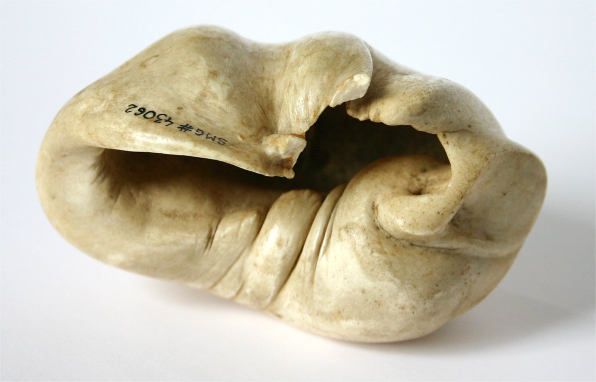 Valöra: Tre hål är borrade i örats släta del, i två av dem är små runda knoppar diam 0,9 cm fastklistrade. I det tredje hålet sitter bara fästet till knoppen kvar Gåva i samband med utställning om snäckor på SMG.