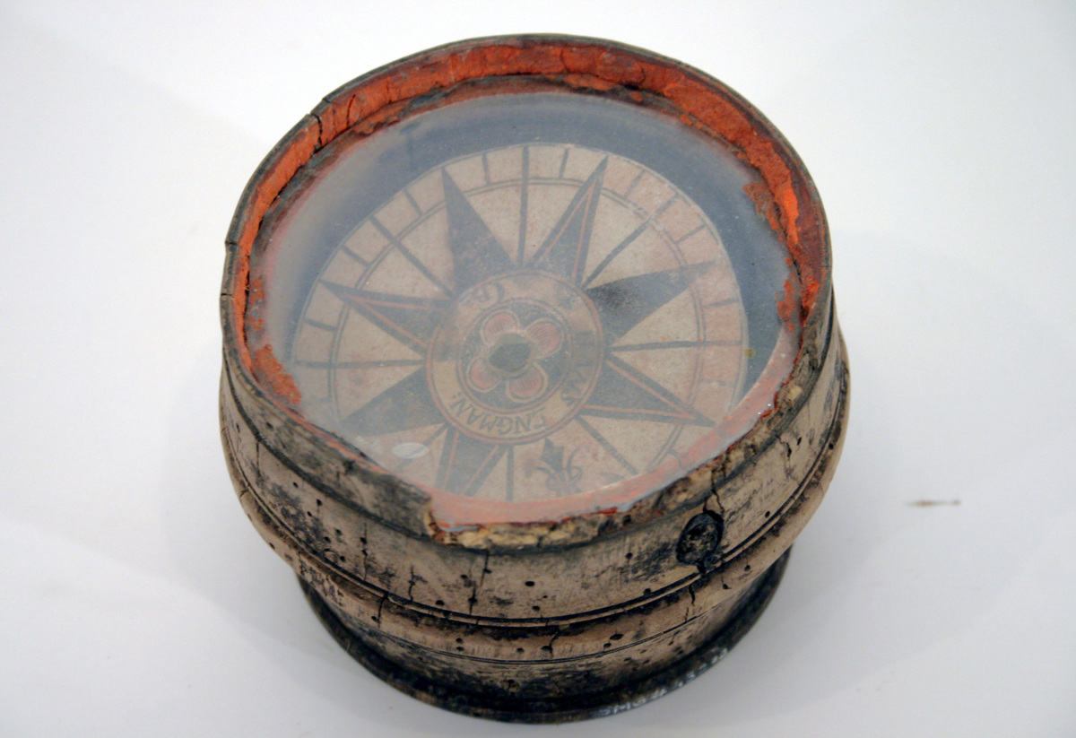 Svarvat hus av trä med profileringar. Ojämnt skuren glasskiva över kompassen, orange kitt. Kompasslinsen har en lilja som norrpol och i mitten står det /Hans Engman: GBG/ eller /…CB/. Användes av släkting till givaren.