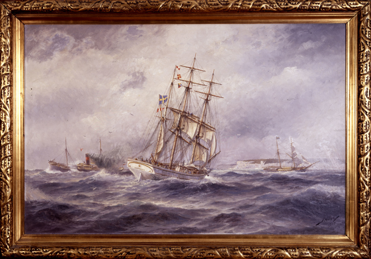 Namnet på fartyget tycks vara fiktivt eftersom inget fartyg med detta namn och tackling funnits i svenska skeppslistor de aktuella åren. Fartyget för svarsvimpel samt signalflaggorna URZ vilket enl. 1902 års signalbok betyder: Rapportera 'allt väl'. Fartyget ses akterifrån kryssande för bl a undre märssegel och fock, i bakgrunden till höger ses en tvåmastad skonare förande svensk flagg, länsande och förande råsegel på förmasten samt där bakom en klippig kust; till vänster ses ett ångfartyg med kraftig skorstensrök förande dåvarande tyska handelsflaggan samt svarsvimpel.