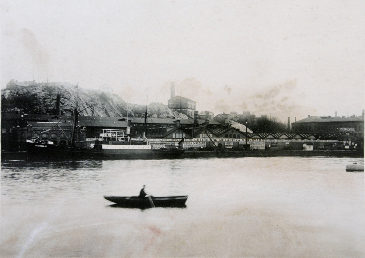 Fotoförstoring för reklamändamål, visande Göteborgs Mek Verkstads AB på sydsidan av älven med ångaren NORNAN liggande vid kajen. I förgrunden syns oskarpt en roddbåt med en man ombord.