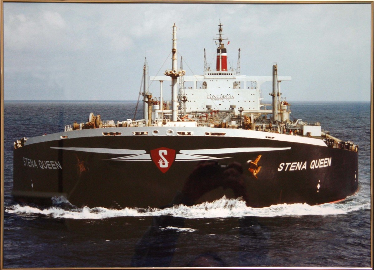 Färgfoto av turbintankern STENA QUEEN taget från luften visande fartyget rakt förifrån.