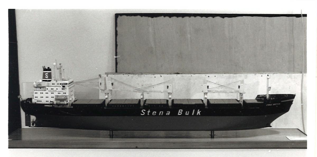 Fullmodell av bulkfartyg, skrovet svart, botten röd, vid överbyggnad. På aktern med vit färg namnet samt hemorten, på vardera bog namnet, på vardera sida STENA BULK. Modellen monterad på lackad träplatta. Limmad glasmonter. Med mässsingstext på plattan. Modellen ommålad 2 ggr på AB Sverres modellfirma. Från början hade den Broströms Rederi AB:s färger. Modellen har använts för reklamändamål.