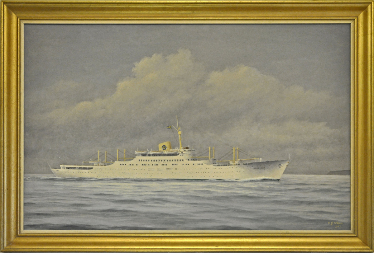 Fartyget var färdigt 1948 - målningen gjordes 1947. Fartyget fick ett längre utbyggt bryggdäck än vad målningen visar.