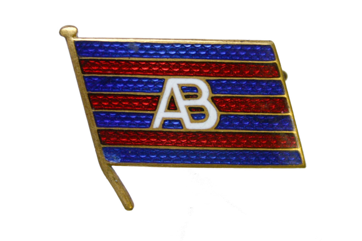 Föreställer bolagets flagga med röda och mörkblå horisontella band, tre röda och fyra blå. Bokstäverna AB i vitt på mitten av flaggan.