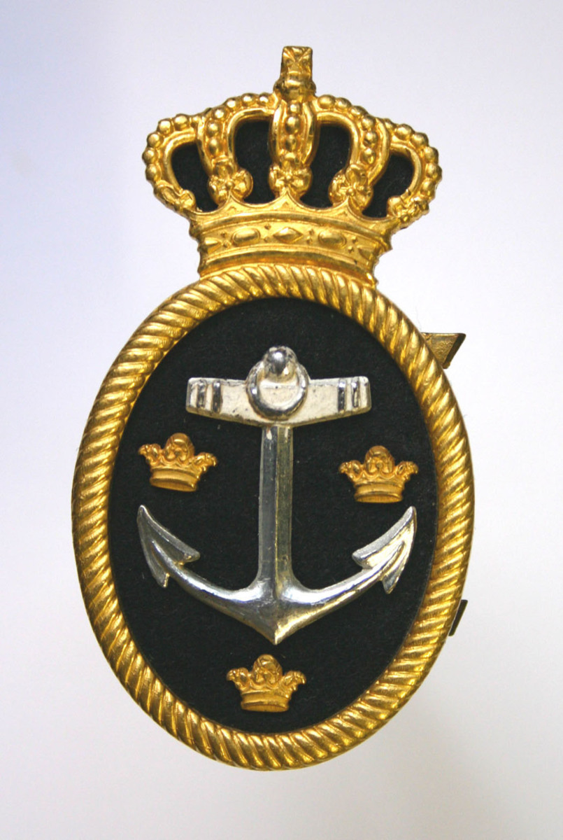 Oval platta krönt med en krona, ankare i silver med 3-kronor kring sig.
